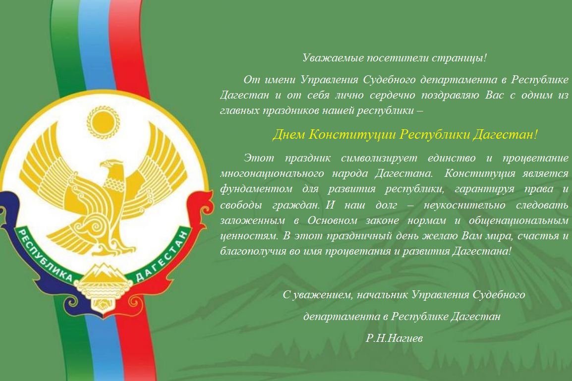 | Поздравление с Днем Конституции Республики Дагестан от начальника Управления Судебного департамента в РД | версия для печати |